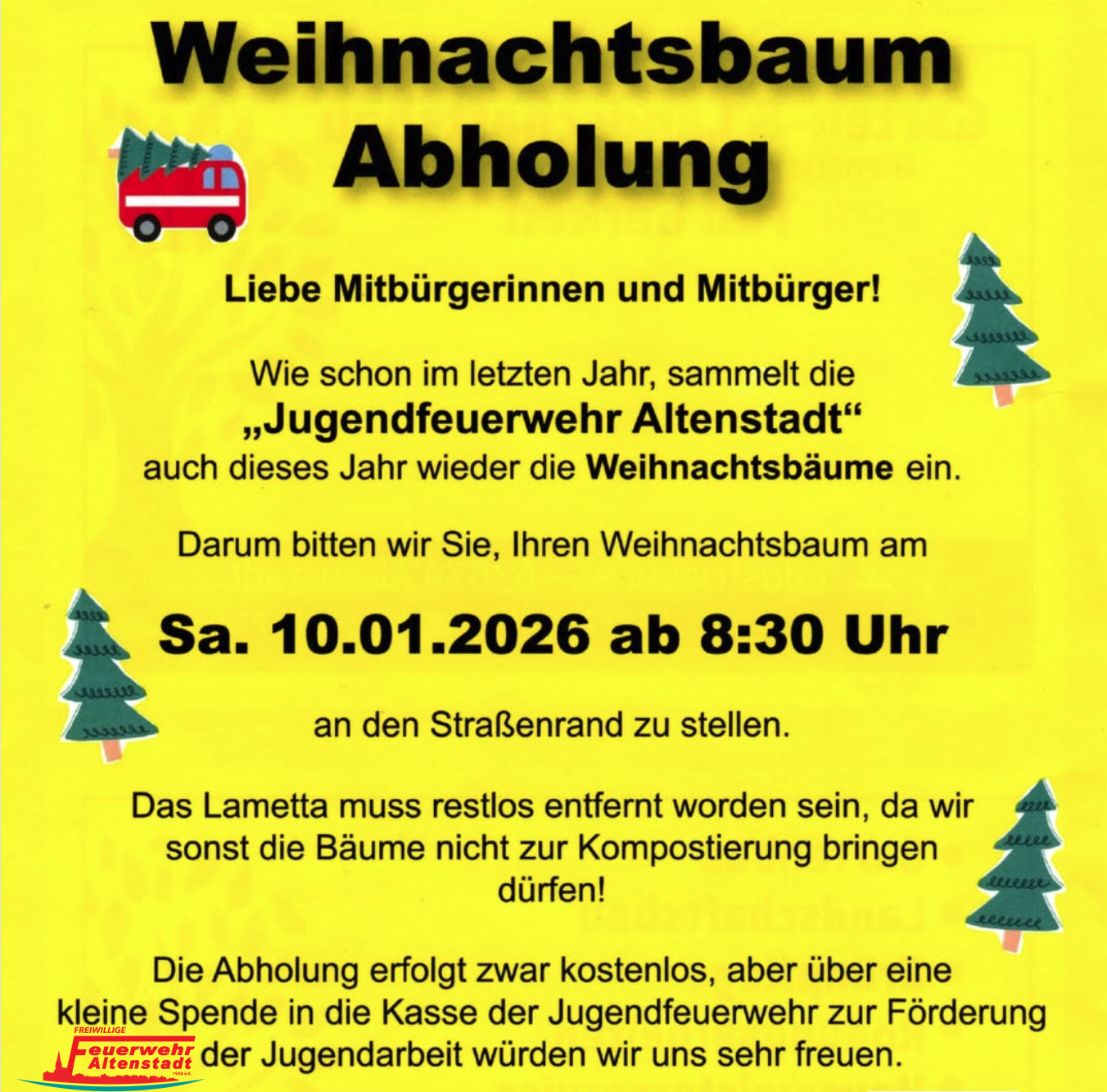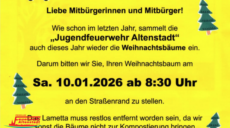 Wie schon im letzten Jahr sammelt die Jugendfeuerwehr Altenstadt wieder die Weihnachtsbäume ein.
