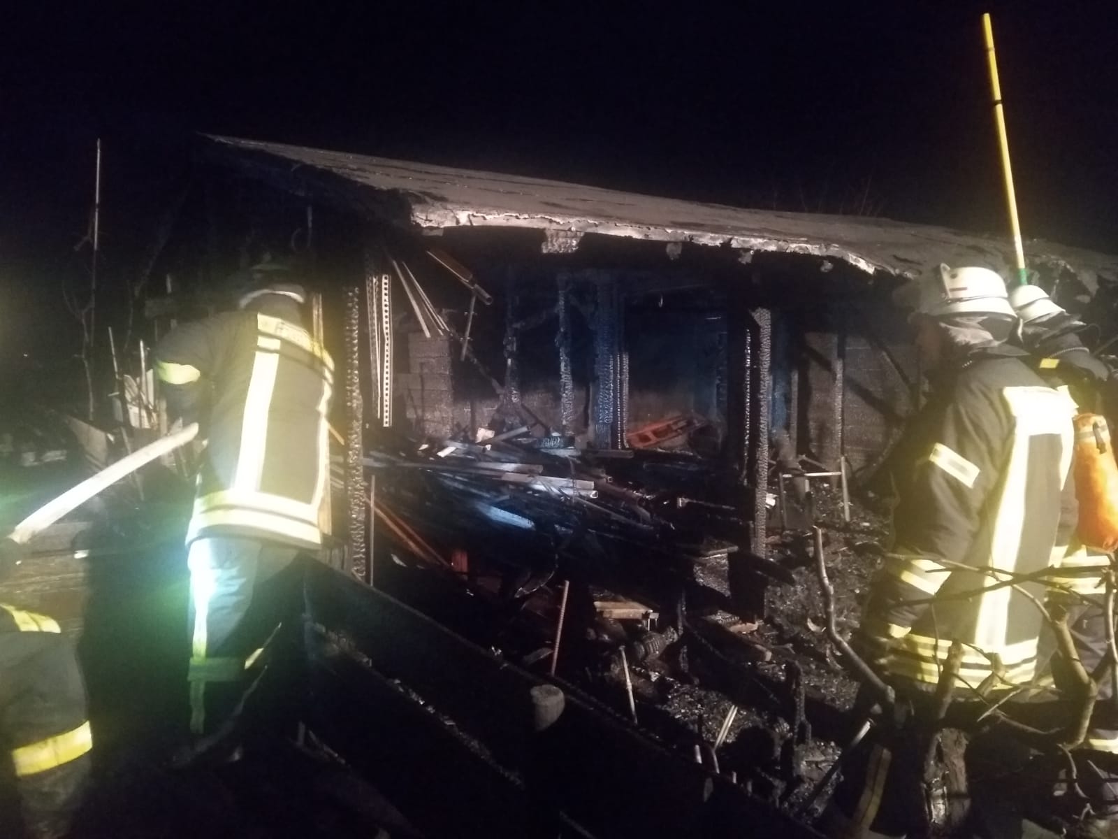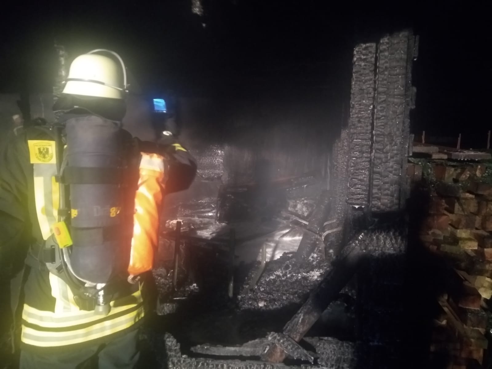 So wurde das TLF Limeshain nachalarmiert und ein Pendelverkehr mit dem TLF Altenstadt zusammen eingerichtet, um das HLF an der Einsatzstelle mit Wasser zu versorgen. Aus der brennenden Gartenhütte konnte eine Gasflasche gesichert werden, diese wurde im Einsatzverlauf weiter kontrolliert. Die Einsatzstelle wurde mit Lichtmasten ausgeleuchtet. Insgesamt waren 3 Trupps unter PA im Einsatz. Die Reste der Gartenhütte wurden im Anschluss eingerissen und auseinandergezogen.